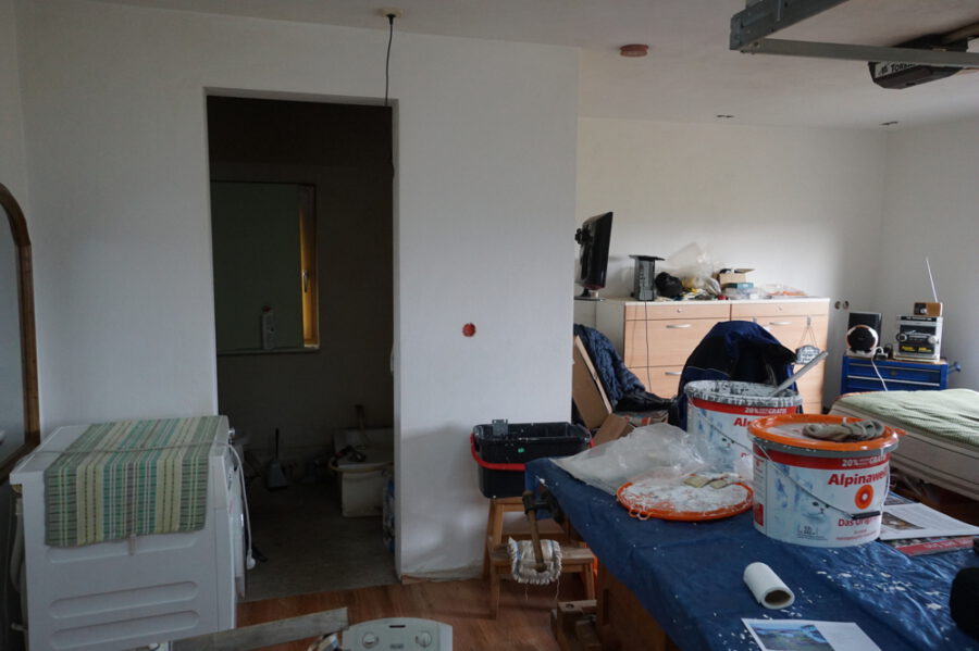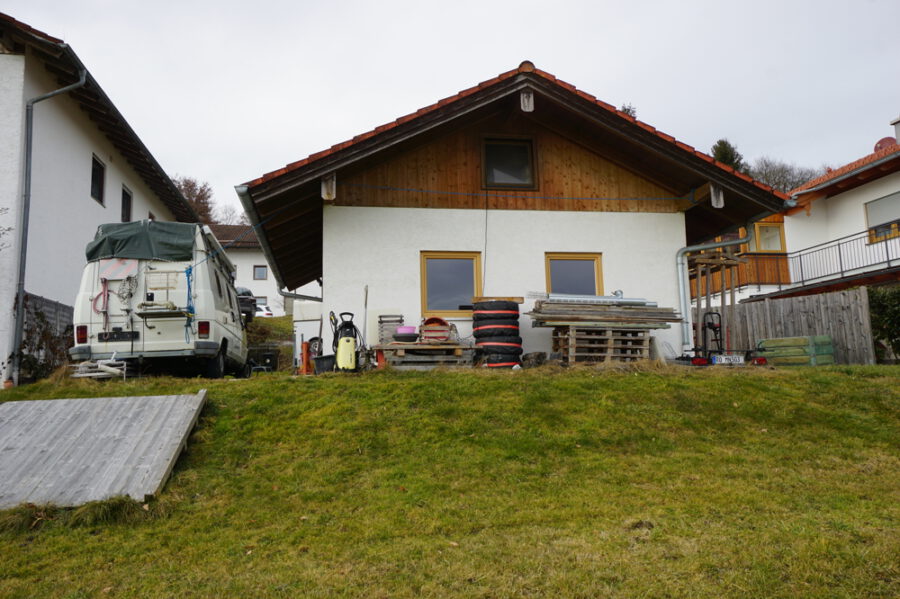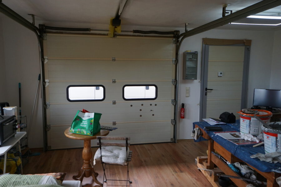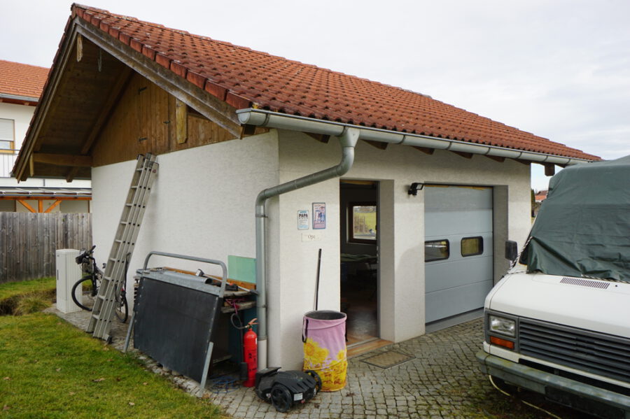 Ursprünglich als Garage und Werkstatt gebaut wird es nun gelegentlich zu Wohnzwecken genutzt. Ein WC und eine Duschwanne sind vorhanden. Das Bad ist bisher nicht gefliest. Strom, Wasser, Kanal und Telefon sind verlegt. Ein Außenstellplatz oben an der Straße gehört mit dazu. Zur Zeit ist die Garage nicht mit einem Fahrzeug erreichbar wegen starker Hanglage im oberen Zugangsbereich. Als Boden ist Laminat verlegt. Das elektrische Rolltor ist betriebsbereit. Eine Heizung existiert bisher nicht.
