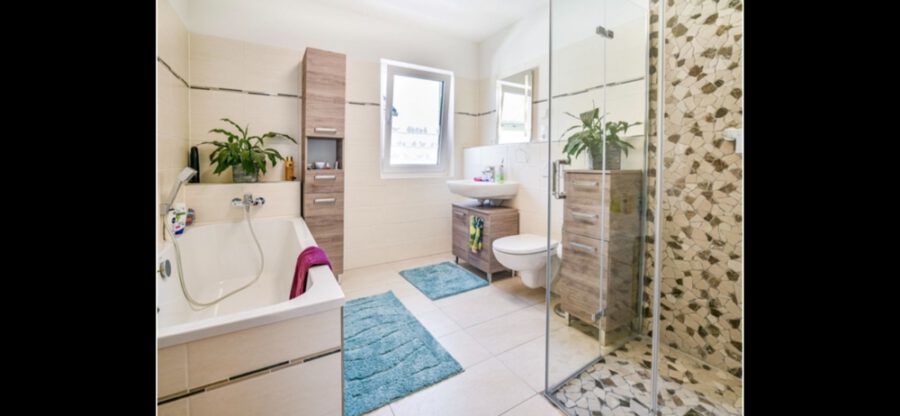Im Dachgeschoß, Bad mit Dusche, an den Dachfenstern ist überall eine Außenjalousie angebracht,