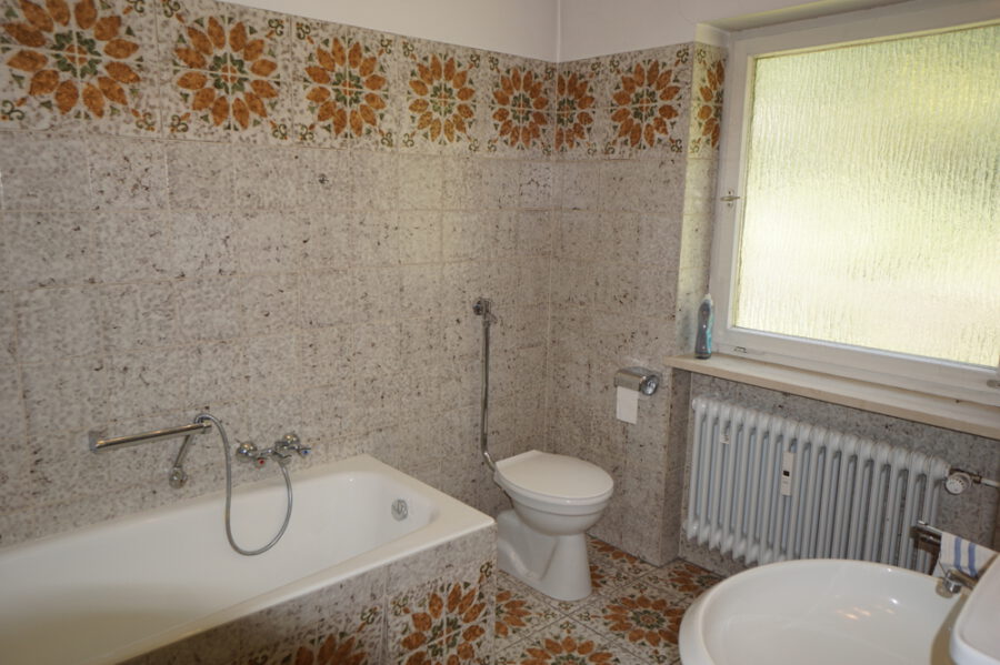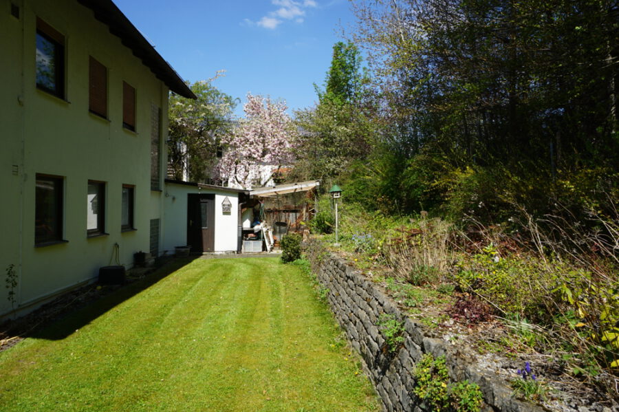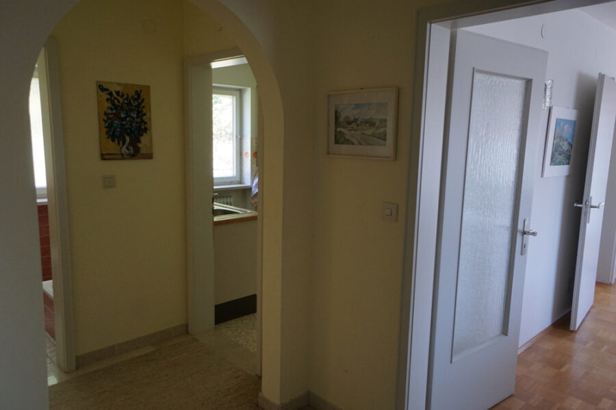 Von einem Zweifamilienhaus welches von einer heimischen Baufirma 1972 gebaut wurde kommt nun die Erdgeschoßwohnung zum Verkauf. Die Wohnung im ersten Stock wird zur Zeit nicht bewohnt. Im Gemeinschaftseigentum stehen das ausgebaute Dachgeschoß sowie die Doppelgarage und der komplette Garten. Das Anwesen ist voll unterkellert, komplett konventionell gebaut. Eine breite Zufahrt führt zur Doppelgarage.