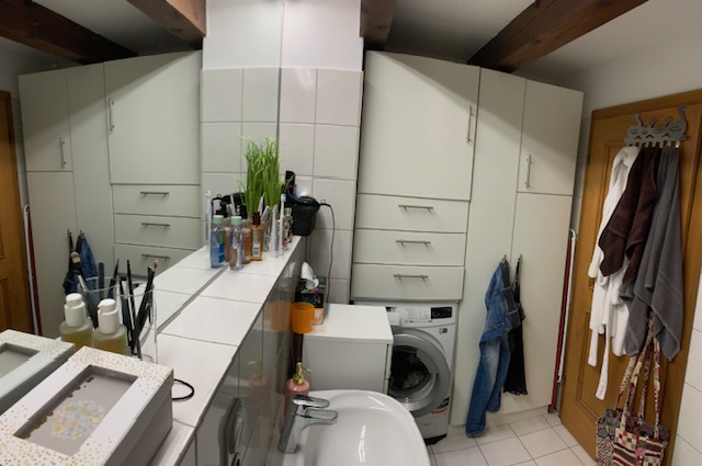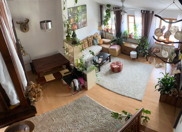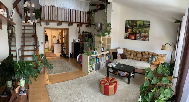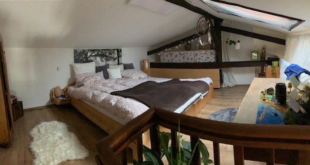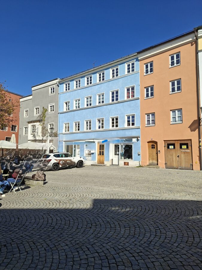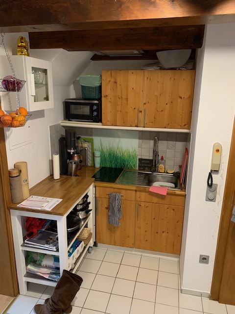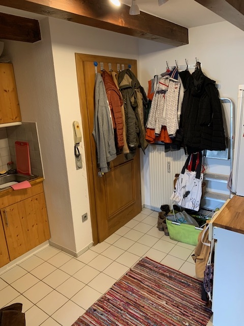 Zehn Parteien wohnen in diesem Altstadthaus. Die Wohnung besteht aus einer kleinen Küchenecke, sowie ein innenliegendes Bad mit Dusche. Hier kann auch eine Waschmaschine und ein Trockner aufgestellt werden. Der Wohnraum weist eine Dachschräge auf. Durch die Fenster blickt man zur Hofstatt runter. Durch die große Höhe gibt es auch eine Treppe die in den oberen Schlafbereich führt. Ein Dachfenster spendet hier zusätzlich Licht. Auf der gleichen Etage befinden sich noch zwei Wohnungen.